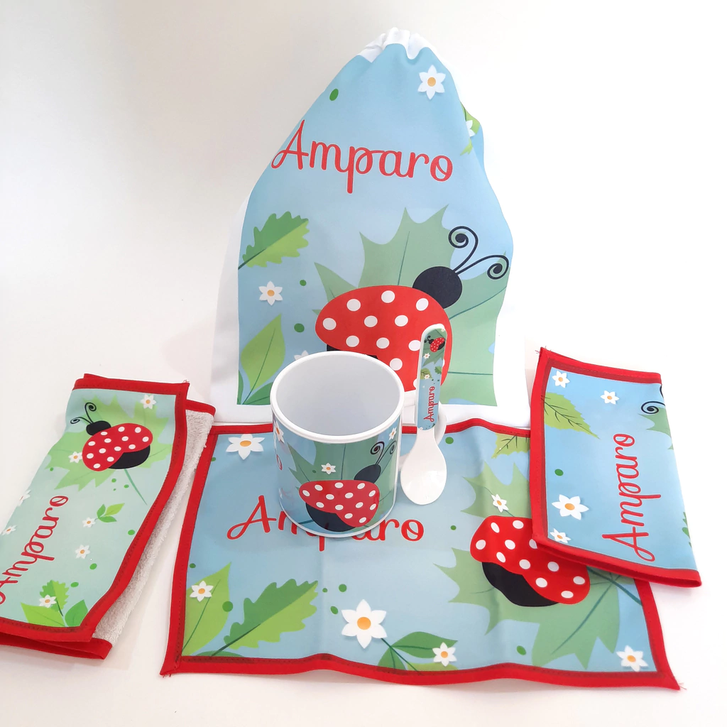 Nuestros kits son los más divinos y originales por que son hechos con ilustraciones propias. Ademas todo viene estampado con nombre para que sea super identificable y no se pierda nada en la salita. Asi que olvidate de las etiquetas!